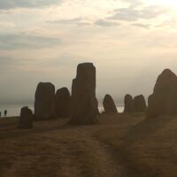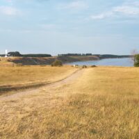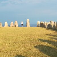 Dann beratschlagen, wie geht es weiter: Klintholm auf Mön und Falsterbo-Kanalen waren die Faforiten. Dienstag früh zeigte sich, dass der Wind stabil mit ~11kn aus Ost kommen sollte. Also beste Bedingungen für die Überquerung der Ostsee Richtung Ystad/Schweden. Und so war es dann auch. Mit 5,5kn Durchschnittsgeschwindigkeit ging es sogar noch etwas östlicher nach Käseberga. Mehrmals mussten wir Frachtschiffen bzw. Fähren ausweichen, aber mit AIS kein Problem. Am Abend noch eine kleine Wanderung von Hillu: erstmal steil Treppen bergauf und dann in rund 400m das Ziel, Ales Stenar. Es soll die größte Schiffssetzung Skandinaviens sein, hat die Form eines Wikingerschiffes und besteht aus 58 teils 2m hohen Granitblöcken. Der Vordersteven des Schiffes zeigt genau auf die Stelle, wo im Midsommar die Sonne untergeht. Und zurück ein toller Blick auf den kleinen Hafen in der Abendsonne.