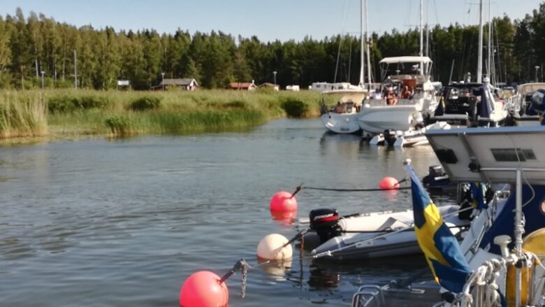 Donnerstag war anfangs immer noch starker Wind mit 16kn, der genau in die Bucht hinein wehte, das hat das Ablegen mit Seitenwind nicht gerade einfach gemacht. Zuerst rund 1h durch den Schärengarten von Kallandsö, Fahrrinne war genau einzuhalten. Dahinter freie Fläche, mit Fock und 1x gerefftem Groß sind wir bei 13kn Wind aus NNO Richtung West schnell vorangekommen. Später musste das Groß ausgerefft werden, es waren nur noch 10kn Wind und genau achterlich. Mehrfaches Halsen war erforderlich. Kurz vor dem Schärenbereich und der sehr engen Einfahrt in den Gästehafen Sunnana, wie üblich, Motor an und Segel bergen. 19gesegelte Seemeilen auf den Värnern – ein schöner Tag. Der Hafen von Sunnana liegt teilweise in den Schären und ist sehr großzügig mit vielen Ferienwohnungen am Wasser angelegt. Der Wind hat sich abends gelegt, so hatten wir einen schönen ruhigen Abend.