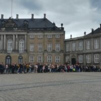 Unser Weg geht zum Amalienborg Castle, der Stadtresidenz der schwedischen Königin. 12:00 Uhr die Wachablösung der Garden vor dem Schloss. Vier- äußerlich nahezu baugleiche- Palais gruppieren sich um den großen achteckigen Schlossplatz, in der Mitte die Reiterstatue Friedrichs V. Zwei der Palais sind durch einen Torbau verbunden, hier marschierte die Garde ein.