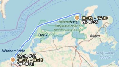 10.9., Dienstag, 119. Tag: Letzte Etappe auf der Ostsee. Saßnitz im Sonnenschein, später ist es bedeckt. Mit 11kn S-Wind können >> mehr