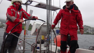 8.6.: 9:10 wird abgelegt, es regnet immer noch, aber es ist Wind. Er kommt mit 10 bis 14kn aus SW, >> mehr